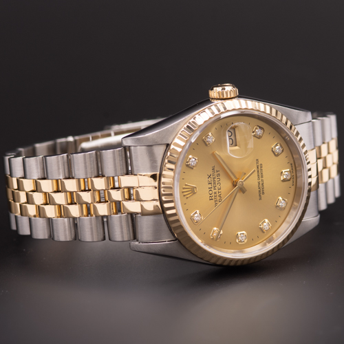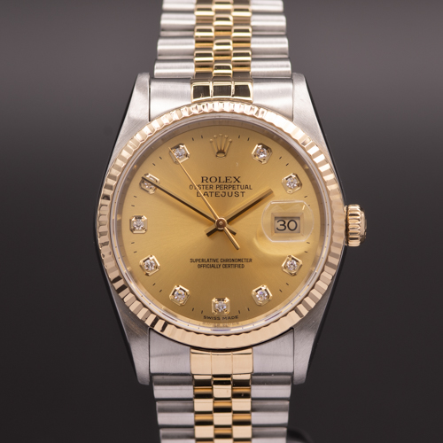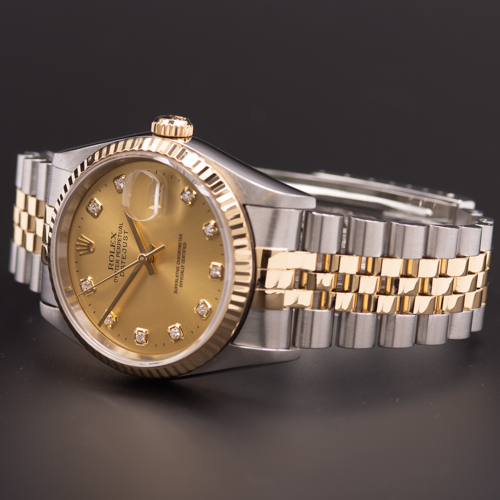 Gents Rolex Datejust in a 36mm Oyster case with fluted bezel. The watch is also fitted with a jubilee bracelet and factory set champagne diamond dot dial. The watch is supplied with box and original warranty paperwork dated 2001. This is a superb classic gents watch. Designed to be durable enough for every day wear, yet also stylish enough for any occasion.