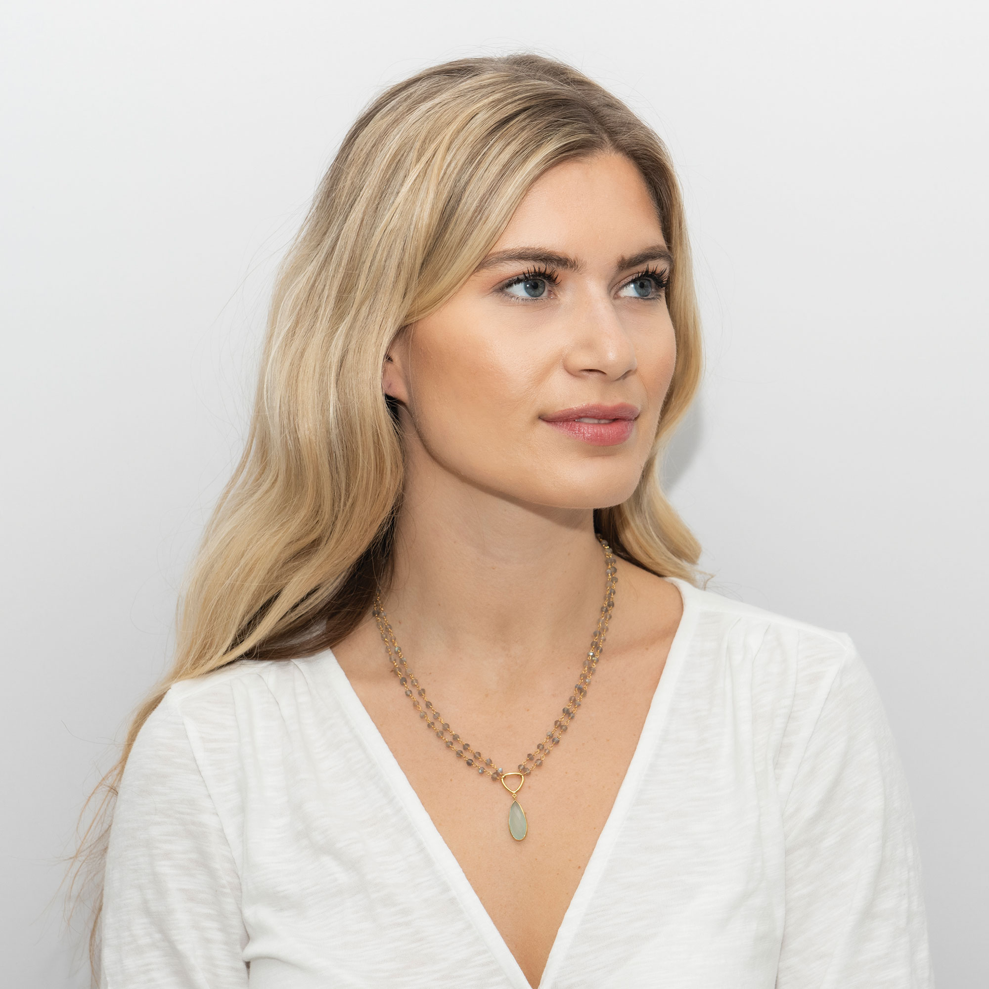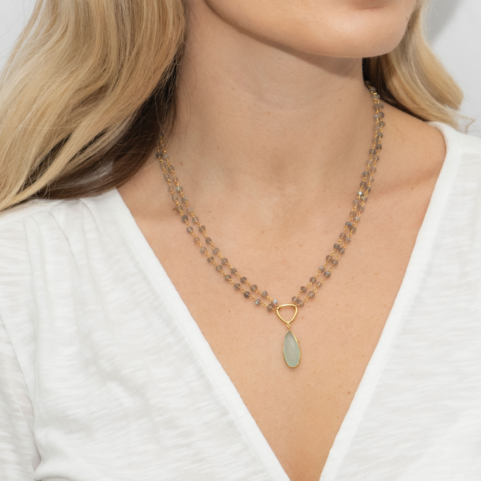 Stunning statement necklace with free spirited design appeal. Featuring Aqua Chalcedony semi precious stone cut with facets and polished to bring out the natural beauty and tone of the stone. Gemstone colour and opaqueness will vary due to the unique nature of semi precious stone variation as each cut stone is individual. Set in 14ct Gold Plated Vermeil on Sterling 925 Silver finished in a high shine finish. Comes complete with a link chain in Sterling 925 Silver plated with matching 14ct Gold Plated Vermeil accented with Labradorite cut beads, length 18″ plus a 2″ extender. Each item comes beautifully packaged in our luxury designed boxes including protective pouch to keep your jewellery item looking its best.