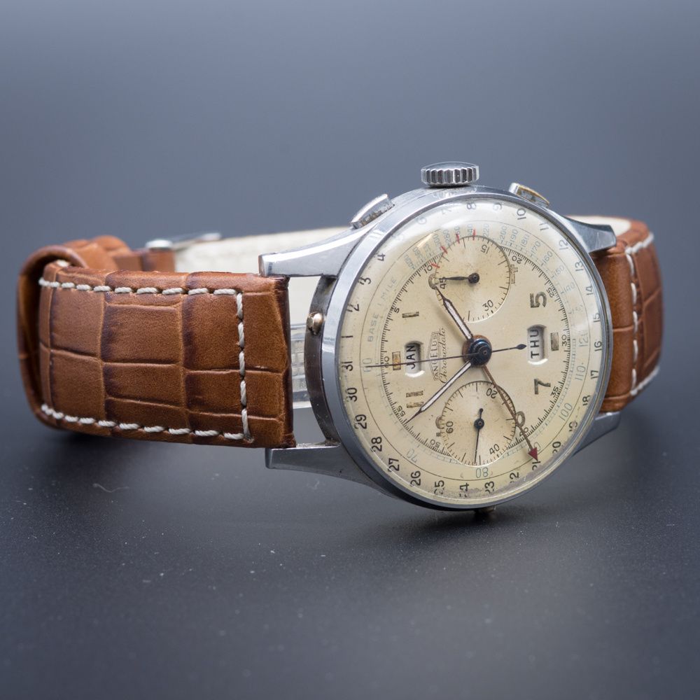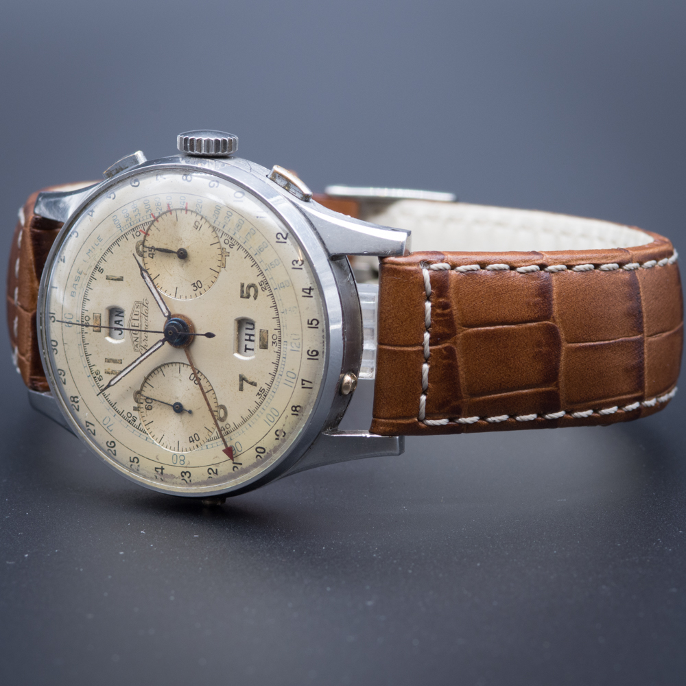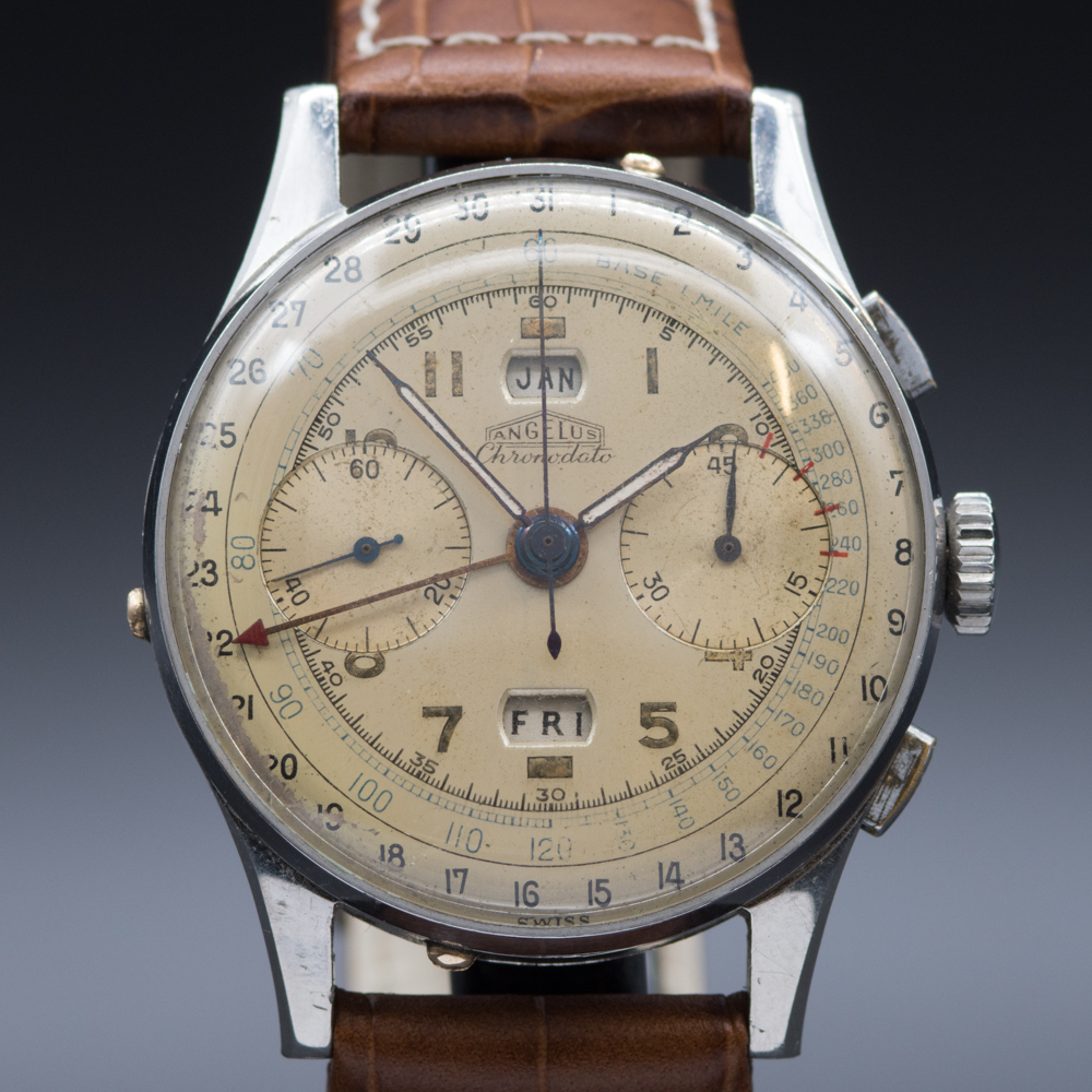 This Vintage Angelus Chronodato from approximately 1945, is a lovely example of a classic chronograph. With the addition of the day, month and date complications this is the most complex of the Angelus holy trinity.  Importantly the in house movement by Angelus. Was at the time of its launch in 1942 a world first  in watchmaking. And marks a significant milestone in the history of the wristwatch.